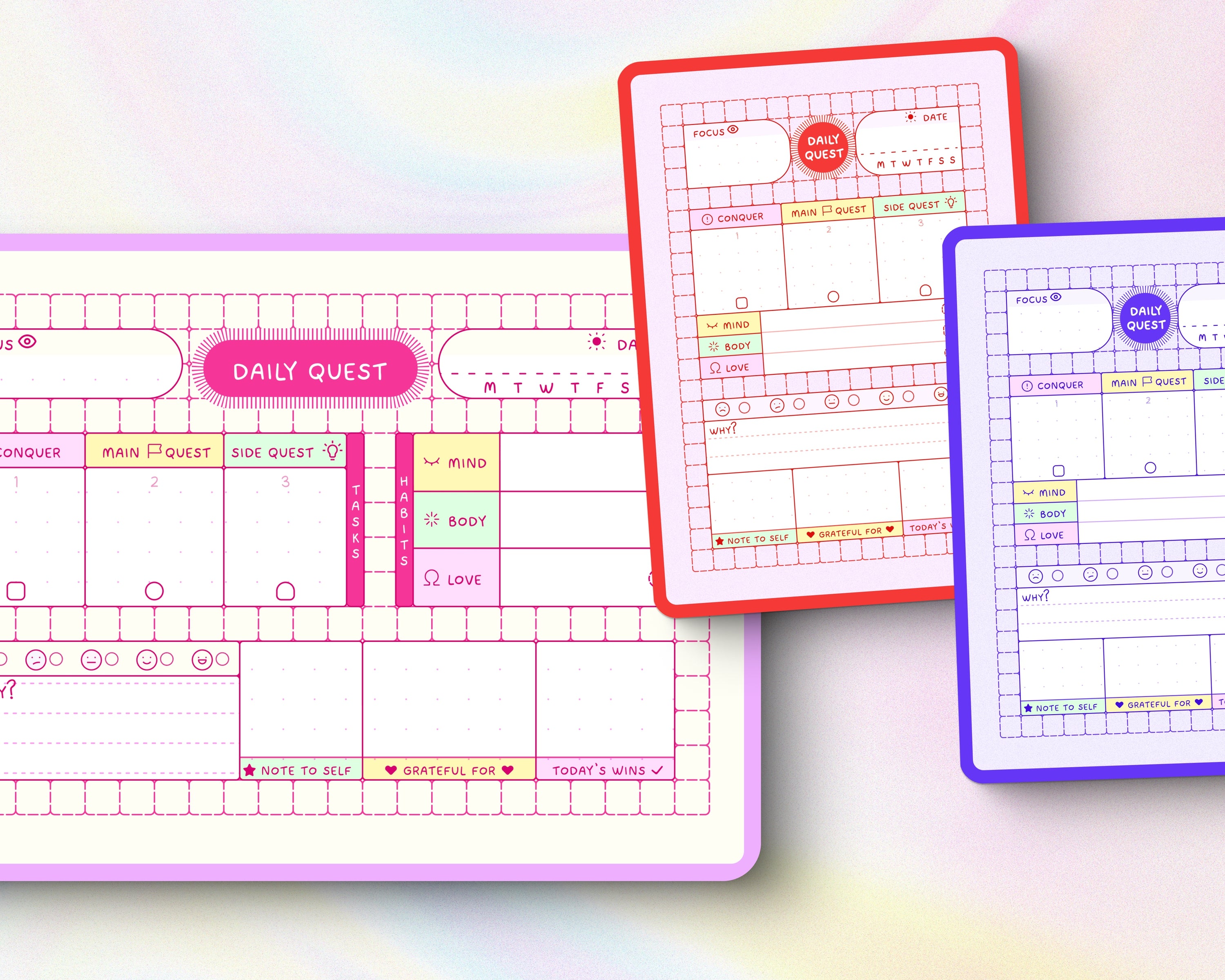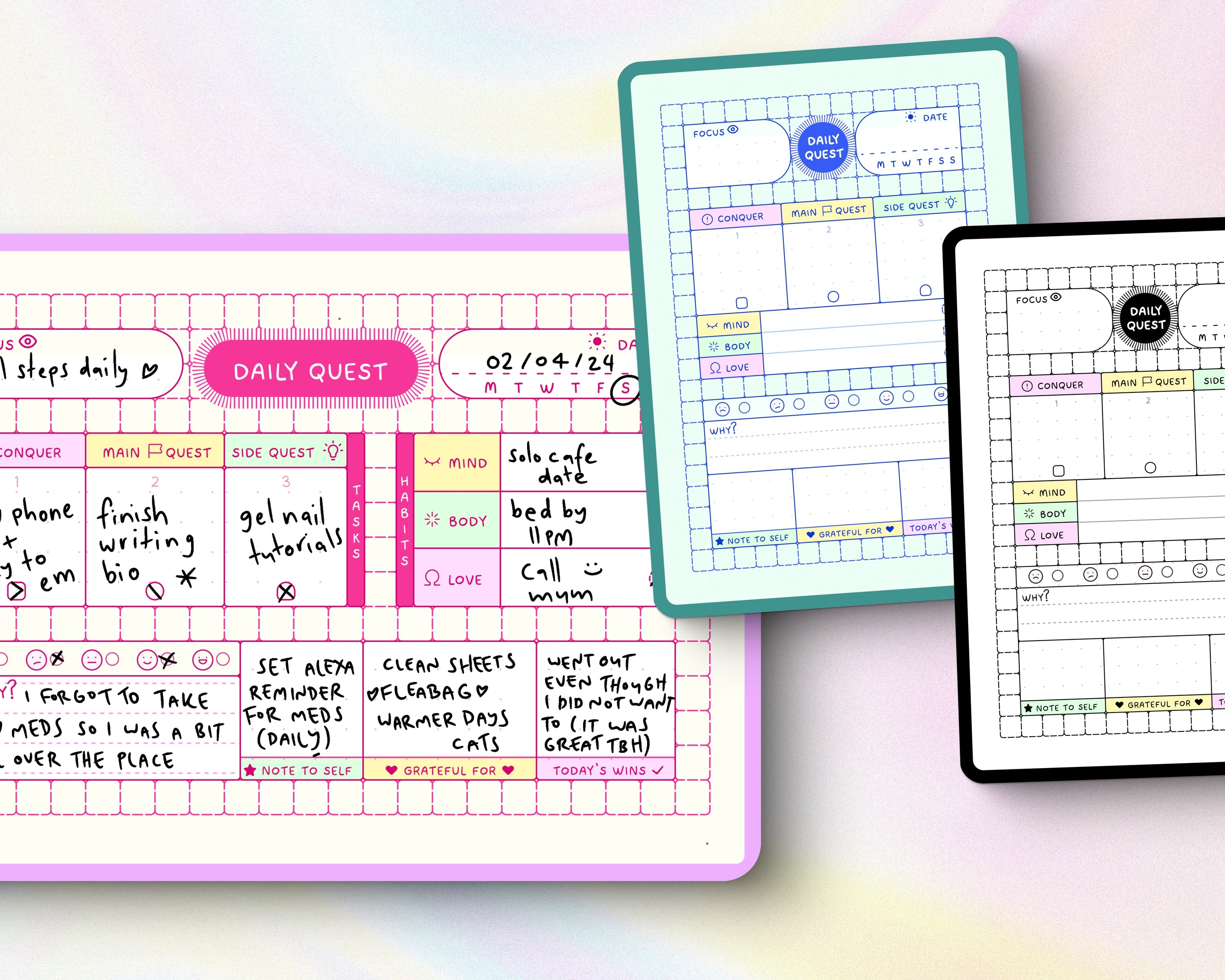 Quest Cards are undated. Not only can you use them forever, but you can also let go of the guilt-trip that comes from missed days & unfilled pages. Use them whenever you need them, with zero pressure. Every check is a win, not an obligation.
